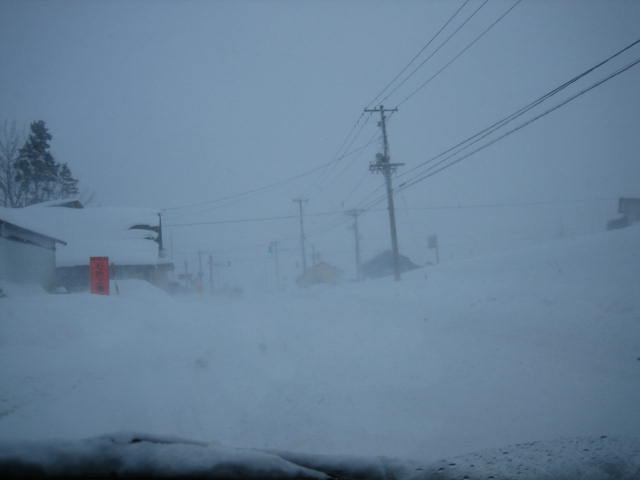 これは、旭山付近の朝の模様ですが、地吹雪はあがるわ、風は吹き付けるわで、ぜんぜん前が見えません
