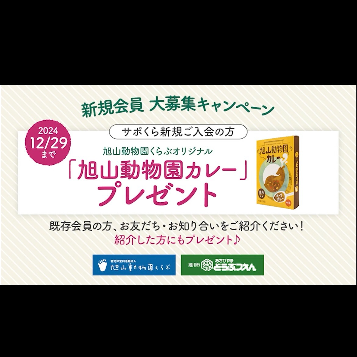 「旭山動物園サポートくらぶ(サポくら)」に入会して旭山動物園を応援しませんか?ただいま「サポくら会員大募集キャンペーン」開催中!新しくご入会いただいた方、またはお友達をご紹介いただいた会員様に、特別プレゼントをご用意しました!【キャンペーン期間】2024年12月29日迄【参加方法:新規ご入会の方】下記のリンクから入会案内ページを経由してご入会のお手続きをしていただければOKです。https://zooclub.jp/news/campaign/※既存の会員様からご紹介を受けている場合は、備考にその方の会員番号や氏名をご記入ください。【参加方法:既存のサポくら会員様】ご紹介いただく新規会員様のお名前などを事務局へお伝えください。【プレゼント内容】園内でも大人気!エゾシカ肉を使用した中辛キーマカレー「旭山動物園カレー」をプレゼント!新規ご入会の方、またはご紹介いただいた既存会員様に1つずつお届けします。【7つのうれしい特典】・サポくら会員証で旭山動物園に入園できる!・会員様限定のイベントに参加できる!・園内の直営店で10%割引きが受けられる!・会員様限定の配信動画が見られる!・旭山動物園の情報誌「モユクカムイ」やサポくら会報誌「Zooっと一緒」がもらえる!・お誕生月から使えるプレゼント引換券がもらえる!・年会費は旭山動物園への寄付になる!https://zooclub.jp/news/campaign/皆様のご入会をお待ちしております!#旭山動物園くらぶ#旭山動物園サポートくらぶ #旭山動物園