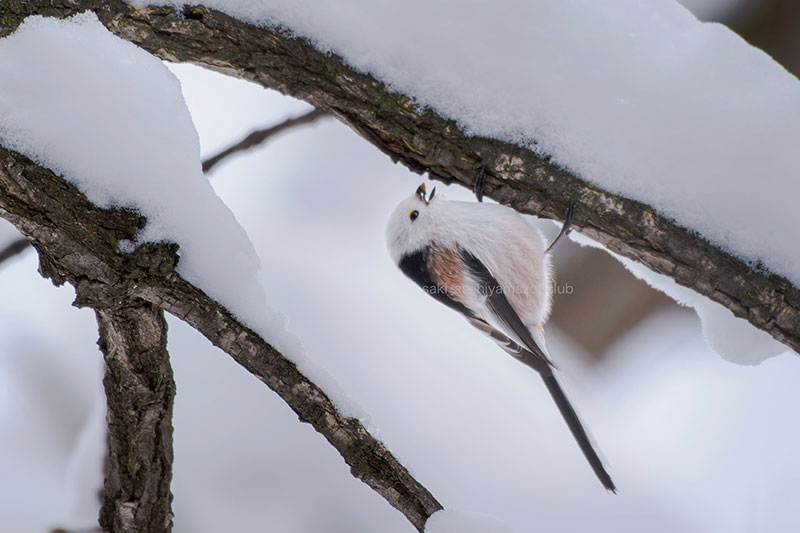 シマエナガと言えば特徴的な「ジュリリ」という鳴き声が有名ですが、ジュリリの前に高く澄んだ鳴き声で「チーチー」と鳴くので、高く澄んだ鳴き声が聞こえる先にいることもあります。