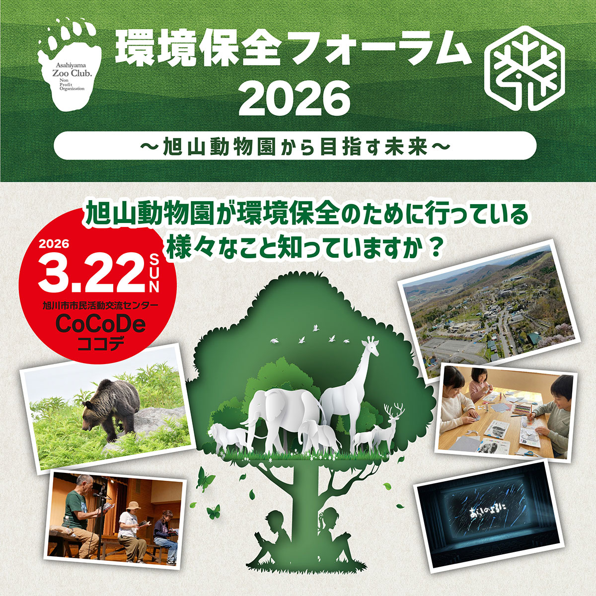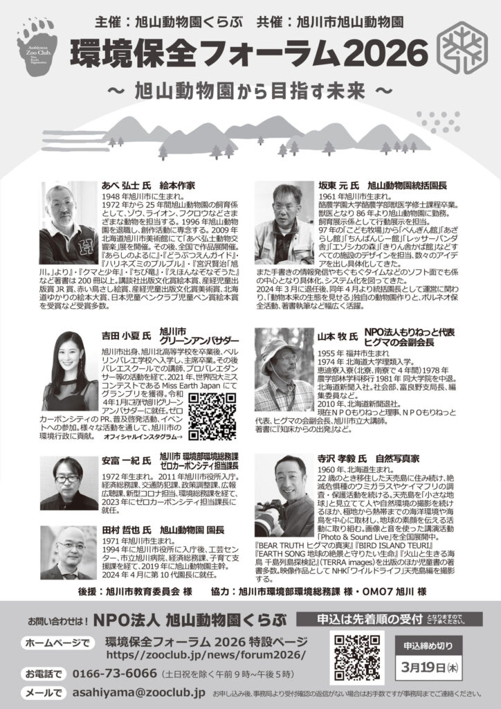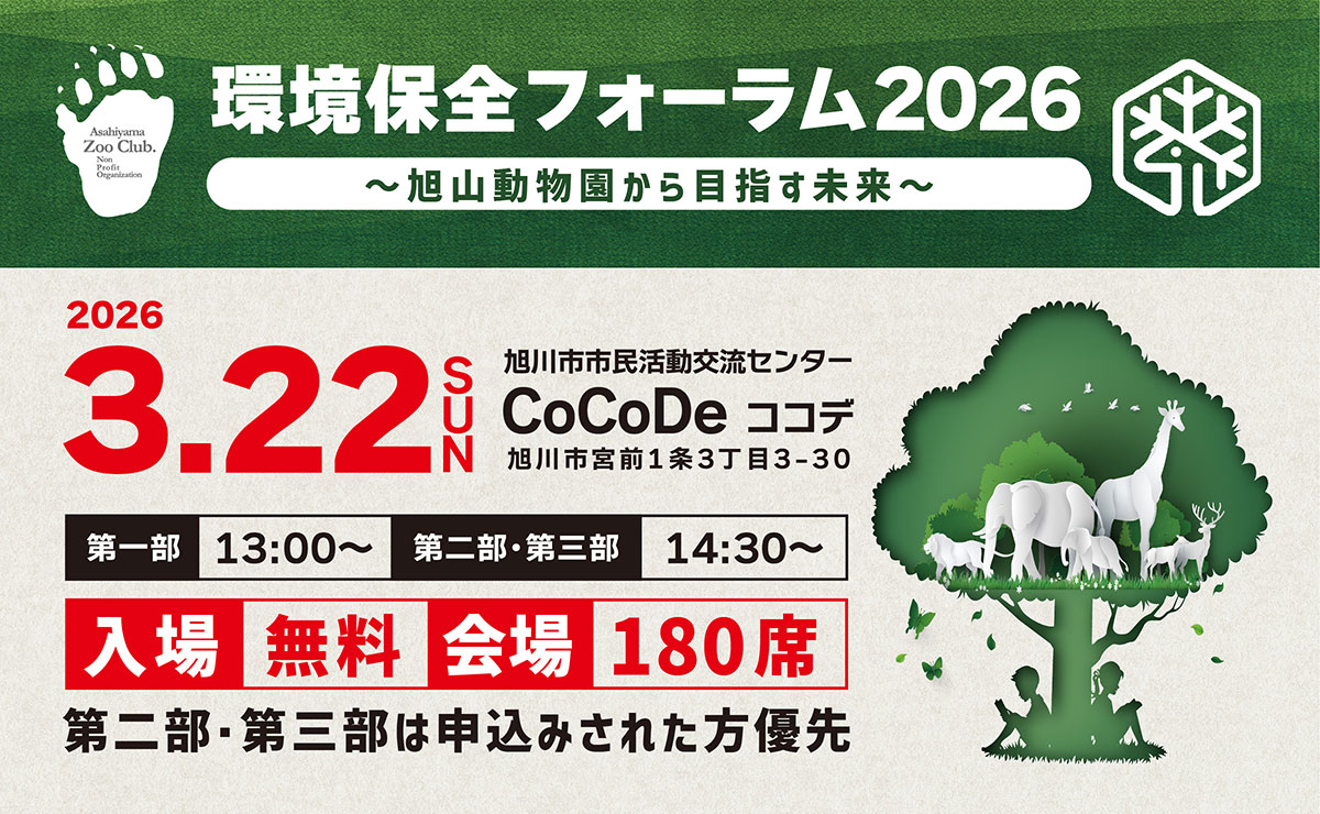 特定非営利活動法人 旭山動物園くらぶは、旭川市旭山動物園との共催により、2026年3月22日(日)に 「環境保全フォーラム2026~旭山動物園から目指す未来~」を開催します。